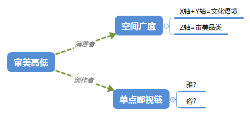 这里又要绕回去,说一下消费者审美和创作者审美之间的关系了,也就是第一张图上唯一的一条竖线,而且我还把他加粗了,为了方便下面再贴一次:
