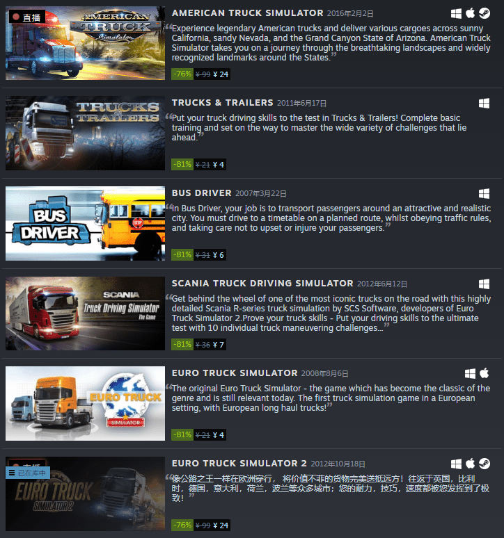 - 《欧洲卡车模拟器》(2008)【81%好评,4800+评价】